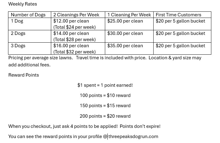 First time customers $20 a 5 gallon bucket. Next time, depending on size of yard & frequency the cost will vary.